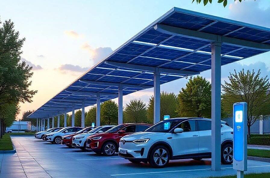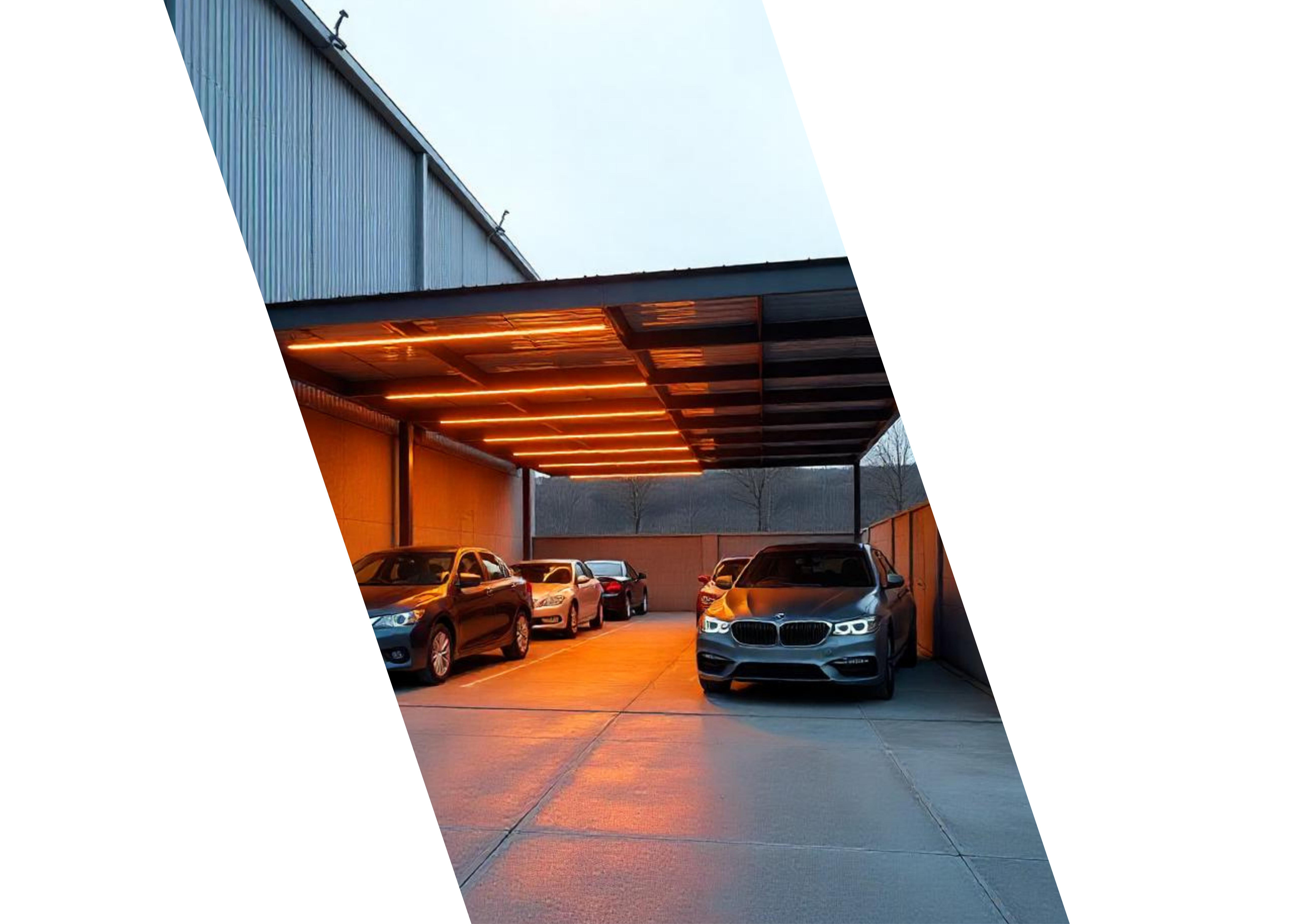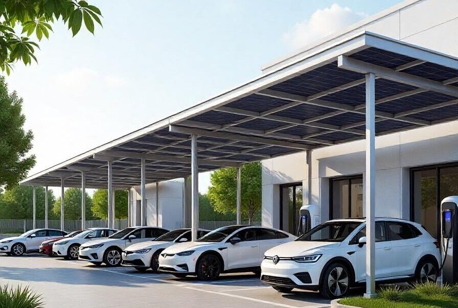 Marquesinas de parking fotovoltaicas diseñadas para proteger vehículos y generar energía al mismo tiempo.